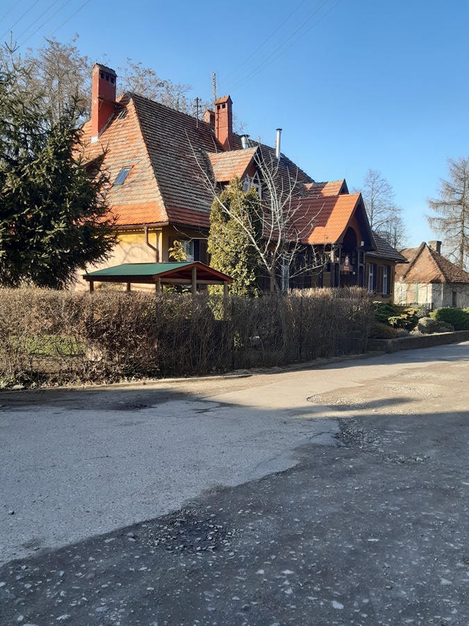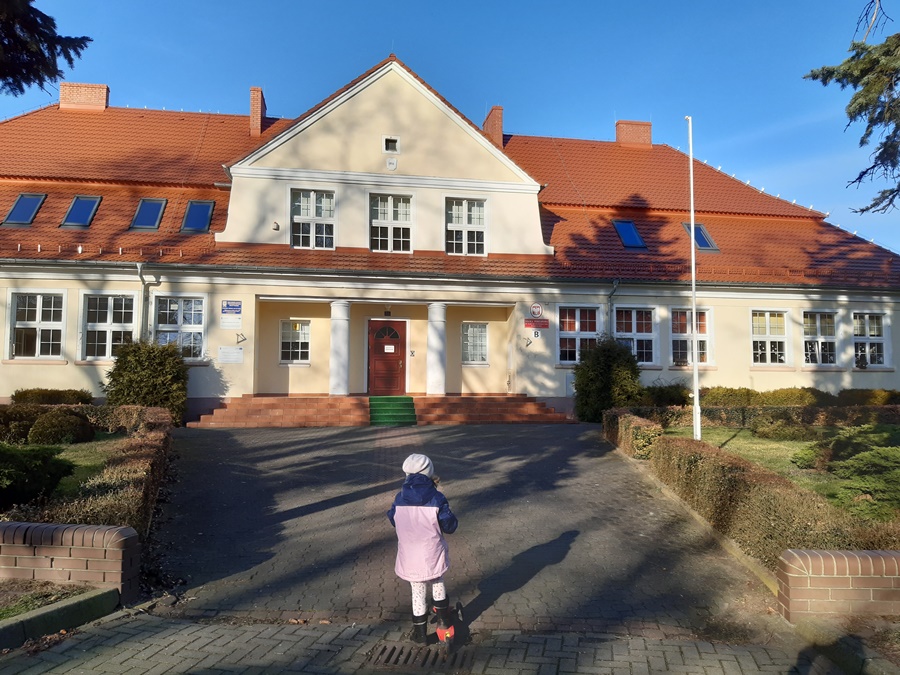Dochodzimy do budynku przedszkola (dawnej pastorówki) zbudowanego w 1906 roku oraz zabytkowego budynku gospodarczego przy przedszkolu. Przed przedszkolem można podziwiać dorodny modrzew. Drzewo to łatwo rozpoznać po bardzo drobnych jasnozielonych igłach, zebranych w gęste pęczki.